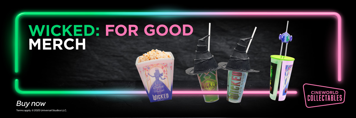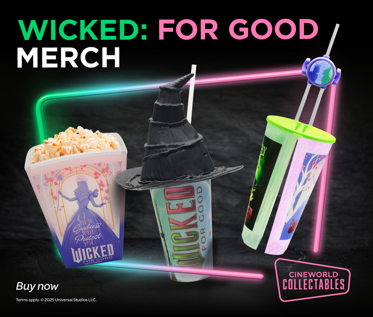 Available in cinemas while stocks last. Restriction: Maximum of 2 of each type of Wicked: For Good merchandise items allowed per person when bought in cinema and maximum of 5 of each type when bought online.The offer includes 1 x Cineworld Exclusive (in UK & Ireland) Wicked: For Good Hat Lid Cup for £8.99 when purchased with any combo or Munchbox, or £10.99 on its own. 1 x Cineworld Exclusive (in UK & Ireland) Wicked: For Good Dual Chamber Cup for £16.99, including a Large ICEE. 1 x Cineworld Exclusive (in UK & Ireland) Wicked: For Good Double Wall LED Popcorn Bucket for £24.99, including a Large Popcorn and Large Carbonated Soft Drink.